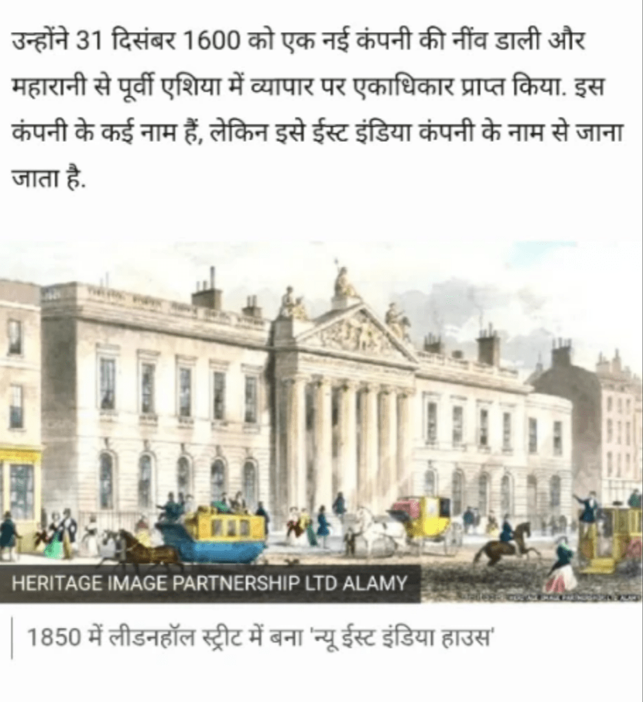 राणी “एलिझाबेथ पहिली” ही इंग्लंडची राणी होती . ईस्ट इंडिया कंपनी , जिने भारतावर दीर्घकाळ राज्य केले, 1600 शतका च्या शेवटच्या दिवशी राणी एलिझाबेथ I ने दिलेल्या सनदेच्या परिणामी हि कंपनी सुरू झाली. या चार्टरमध्ये कंपनीला ईस्ट इंडीजमध्ये व्यापार करण्याचा अधिकार देण्यात आला होता.