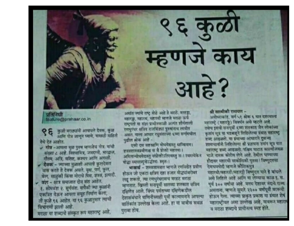 मराठा जाती महाराष्ट्रावर राज्य करणारे जे क्षत्रिय राजवंश झाले. जसे सातवाहन, वाकाटक, चालुक्य, राष्ट्रकूट, शिलाहार, देवगिरीचे यादव तर या सर्व राजवंशांचे वंशज आत्ताचे 96 कुळी मराठा आहेत.