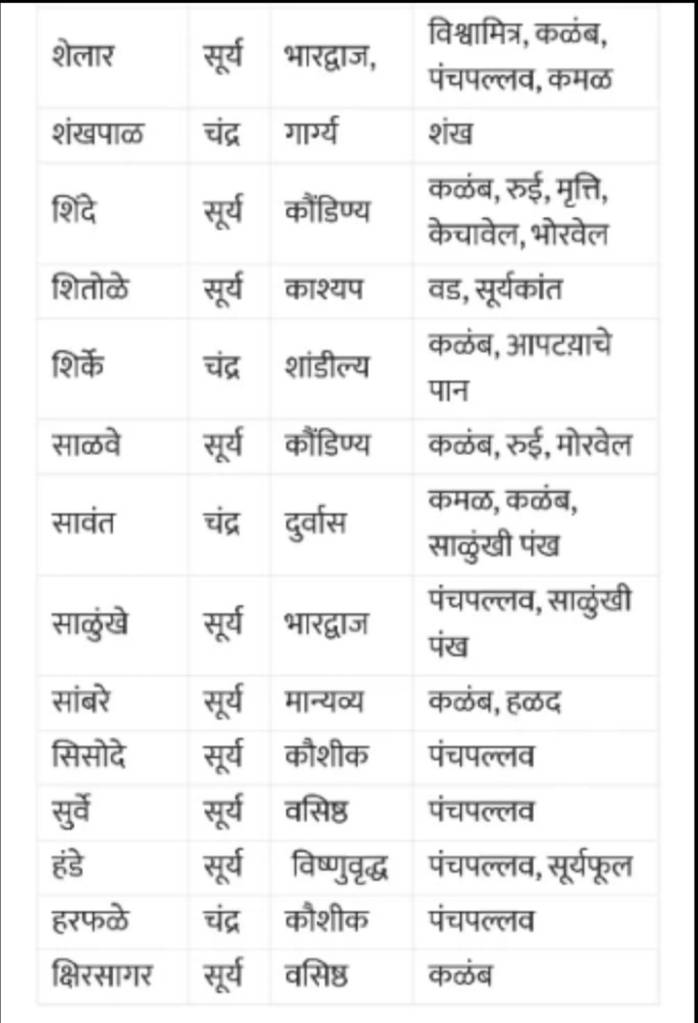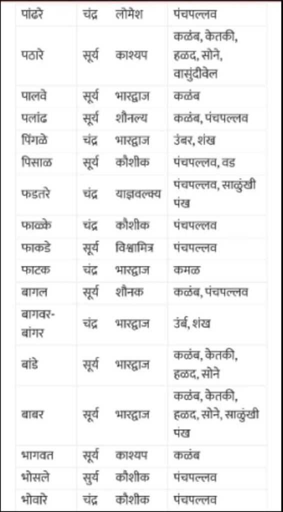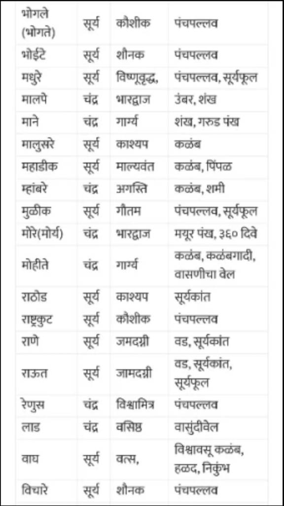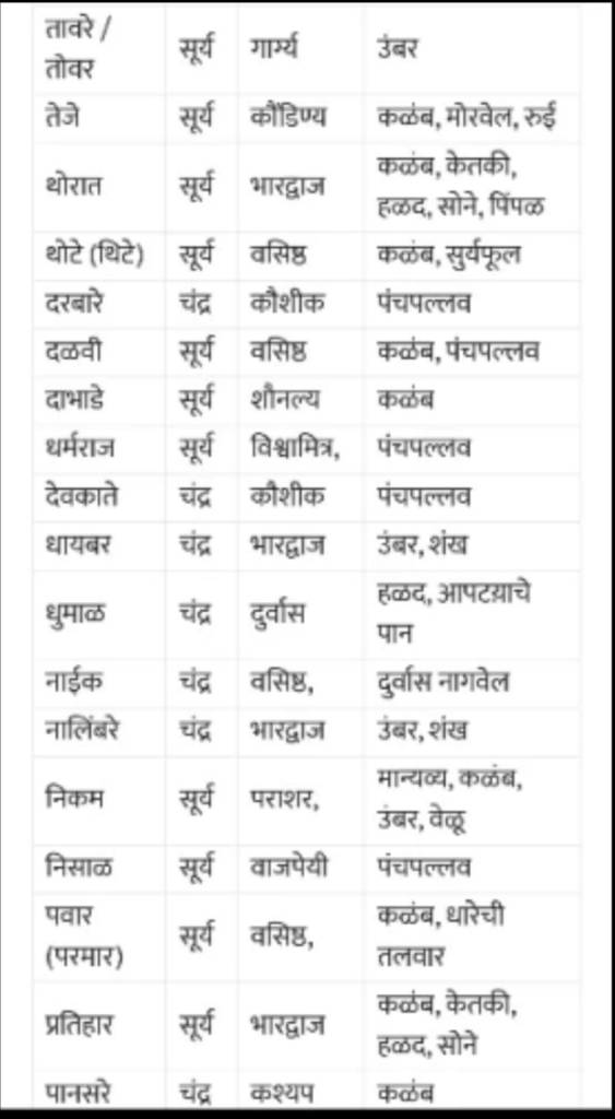 🚩 पवार:- सोमवंशी राजा पवार, सिंहासन:- धारानगर (मध्यप्रदेश धार शहर), सिंहासनाचा रंग लाल, छत (चत्र):- लाल, चिन्ह:- लाल, ध्वजस्तंभावरील चंद्र, कुळ देवी:- जगदंबिका, कुळ वस्तु ( देवक):- तलवारीची धार किंवा कळंब, गुरु:- वसिष्ठ, गोत्र:- पवार, वेद:- रुग्वेद, मंत्र:- गायत्री. कुळ, रेषा, आडनावे:- अ) आंबोटे, उबडे, ओढे, कानसे, काळसकर, काळगे, कोडगे, कोडे, कौस्तुभे, खरनार, घुगरे, चांदणे, जयदाळे, आमेदकर, डनखरे, दाल्पे, दुखंडे, दुर्वेहरदेहळकर- – हे वशिष्ठ गोत्री, गोत्र प्रमर आहेत.
